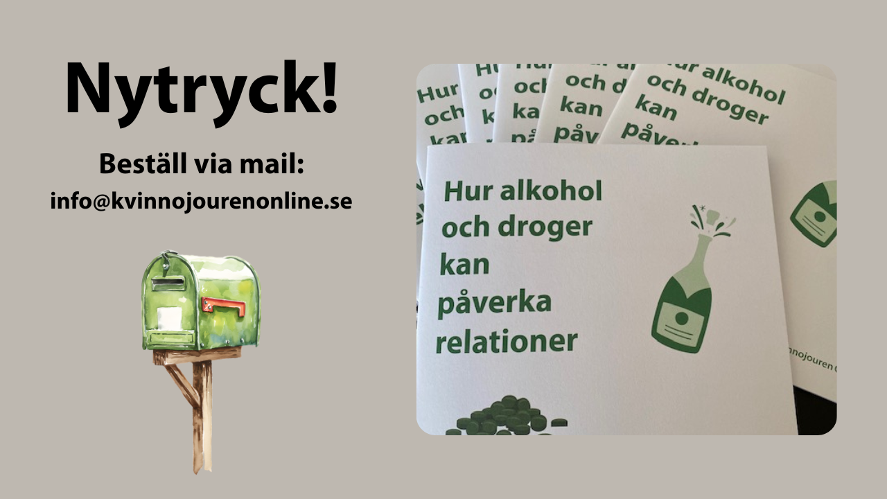 Nu har vi tryckt nya broschyrer på temat “Hur alkohol och droger kan påverka relationer” med stöd av medel från Brottsofferfonden. Broschyren vänder sig till både verksamheter och privatpersoner och kan beställas kostnadsfritt från oss.